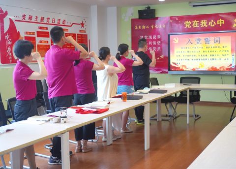 首先,全体党员面向党旗,重温入党誓词。铮铮誓言,不仅是共产党员对自我身份的一次重新认识,更是对自身使命的充分思考。铿锵有力的宣誓声,不仅唤起了党员坚守教育的初心,更唤起了履行教师职责的切实行动。