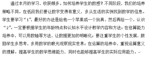 卢主任就如何打造一堂高质量的课,给老师们提出了四点宝贵的建议,接着低、中、高段分别选取一节体现数感的教学内容,以备课组为单位,搜集查阅相关资料,充分细致地了解学生的学情,深度钻研教材教法,精心打磨一节与数感相关的研讨课。老师们反复商讨修改教学设计,想方设法通过多样的教学活动使学生建立数感,立求教学中有基础,有生长,有延伸,有勾连,让学生真正达到会观察、会思考、会表达、会应用、会迁移、会反思的要求。