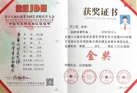 在第十七届百花奖全国艺术特长生大会暨2023中国艺术特长生专项技能大赛中,我校罗江桐同学演唱的《孤独的牧羊人》一曲,以灵动的歌声、自信的表演,荣获全国总决赛独唱项目小学c组金奖。