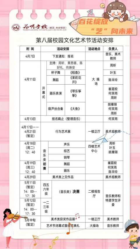 本届校园艺术节的主题是“百花绽放,艺向未来”,将从“艺术表演类”和“艺术作品类”两个项目展开。其中“艺术表演类”包括声乐、综艺、器乐和舞蹈;“艺术作品类”包括绘画、陶艺和书法,同学们可以选择以上任意项目施展自己的艺术才华。校园艺术节的举行,又一次奏响了我校推进素质教育的凯歌,又一次为我们小学部全体学生搭建了展示自我的舞台。同时也是我校践行“六个一”工程之每个学生都要有一项艺术特长活动的具体体现。