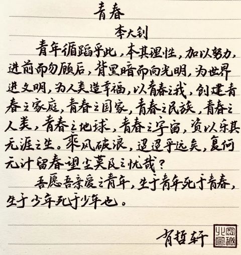 《青春》这篇文章写于1916年,大钊先生正值青春,当时政局多变,想着那生活在水深火热中的人民,他提笔,愿青年“不在龈龈辩证白首中国之不死,乃在汲汲孕育青春中国之再生”。他想要中国再次有着勃勃生机,让中国繁荣富强,便写下此文,以激发当代青年之爱国热情,此文蓬勃的气势,使我不由得热血沸腾,激情澎湃,这就为我爱此文之理由。