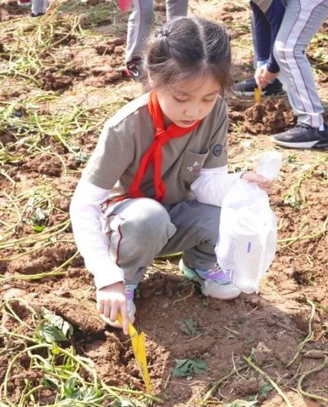 一下车,映入眼帘的一大片红薯地瞬间点燃了孩子们的激情。孩子们纷纷卷起袖口,忙碌地在田地中穿梭,拿着五颜六色的小铲子,用手掌把红薯叶扒开,使出九牛二虎之力刨土,不一会儿,形态各异的红薯呈现在了我们眼前:有萝卜形的、有圆形的、有棒状的......每每发现一个红薯,孩子们就像找到宝贝一样,兴奋的向大家展示战利品,比比看谁挖出来的红薯大,看看谁刨出来的红薯多。