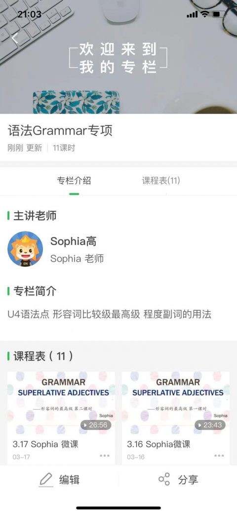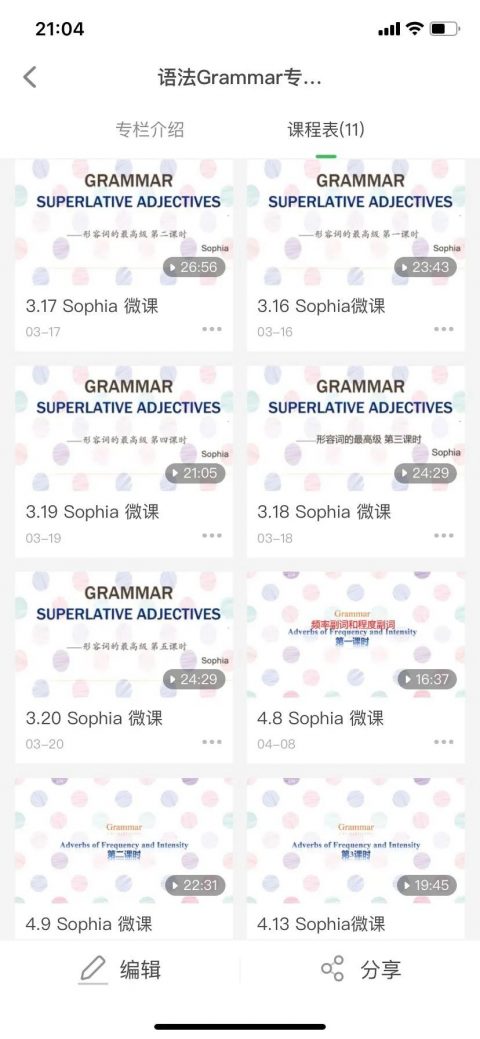 同时,Sophia老师把上过的微课归纳成小专题,方便学生二次观看复习巩固,让英语相关知识体系以微课的形式一直存在,如语法专题微课。