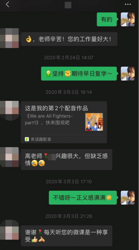 记忆深刻的是疫情严峻的居家隔离期间,收到国四(2)学生Angela H的这一段配音作品,像冬日雨夜里的一个拥抱,一下子温暖了师生们的心房,仿佛拉近了大家隔空的距离。
