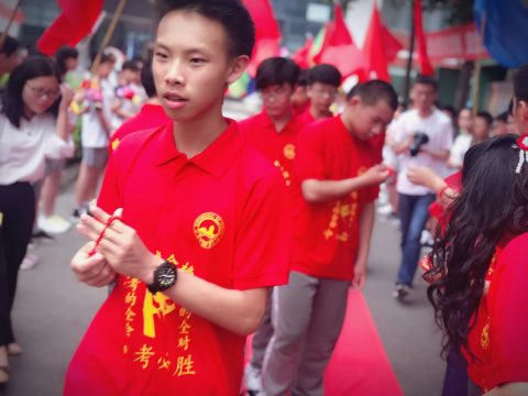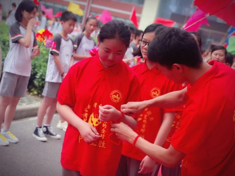 接下来,七八年级学生的祝福声响彻云霄,“为明中考,决战沙场,2019,续写辉煌”的呐喊声在校园的上空回荡。九年级学生简短的回应“中考必胜”,斩钉截铁。在鲜艳的花束中,在庄严的红毯上,在迎风招展的彩旗里,在催人奋进的战鼓声中,全体九年级的师生昂首阔步走出校门。迎接他们的还有温馨的幸运绳,学校领导老师们亲手把这份祝福系在每一名学子手上,承载了校领导、老师们的鼓励,家长们的期盼还有来自学弟、学妹们的祝福。