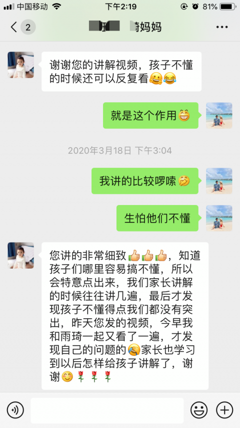 疫情无情,人间有情,特殊时期,特殊方法,不变的是这一颗颗爱生的之心。我们祈祷疫情早日过去,待学生们重返美丽的校园。可是在这居家学习的时光里,学生的心理健康是最重要的,黄老师一直心系学生,开学的家长会,黄老师想着如何用更好的方式展开,可以让孩子们抛开疫情的恐慌又可以解决孩子对老师和同学们的思念之情?黄老师最终决定以录视频的形式出现在孩子们的视线中,让孩子们在班级群中畅所欲言。