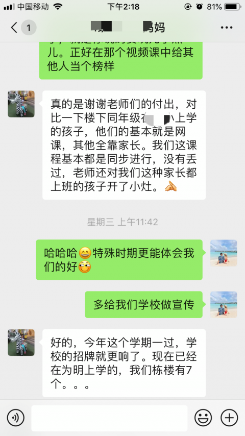 随着疫情的好转,家长们纷纷复工,此时便出现了个别孩子无人看管的情况。黄老师发起调查问卷了解情况之后,便单独设立了一个辅导小组,将家长因工作可能无法看管和网课学习期间需要帮助的孩子拉在一起。黄老师每天利用数学答疑之后的时间,单独为他们视频连线讲解当日习题。黄老师说,建立单独辅导群的一个月以来,看到了这些孩子的数学学习有所进步,看到家长发来的那一声感谢,心里甚至满足和幸福。后期再筹划建立一个班级的“自习室”,来帮助复工的父母监督孩子在家单独完成作业,同时孩子们完成作业的过程中遇到什么困难老师们也可以及时帮忙解答。这样可以协助孩子们高效学习,也减轻家长们的负担。