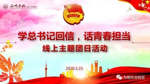 为深入学习贯彻习近平总书记给北京大学援鄂医疗队全体“90后”党员的回信精神,凝聚众志成城抗击疫情的强大青春力量,3月23日上午,我校初中部团委集中开展“学总书记回信,话青春担当”线上主题团日活动。团委书记胡惠施老师主持,初中部全体中层干部、所有团支部以及全体团员参加了本次活动。