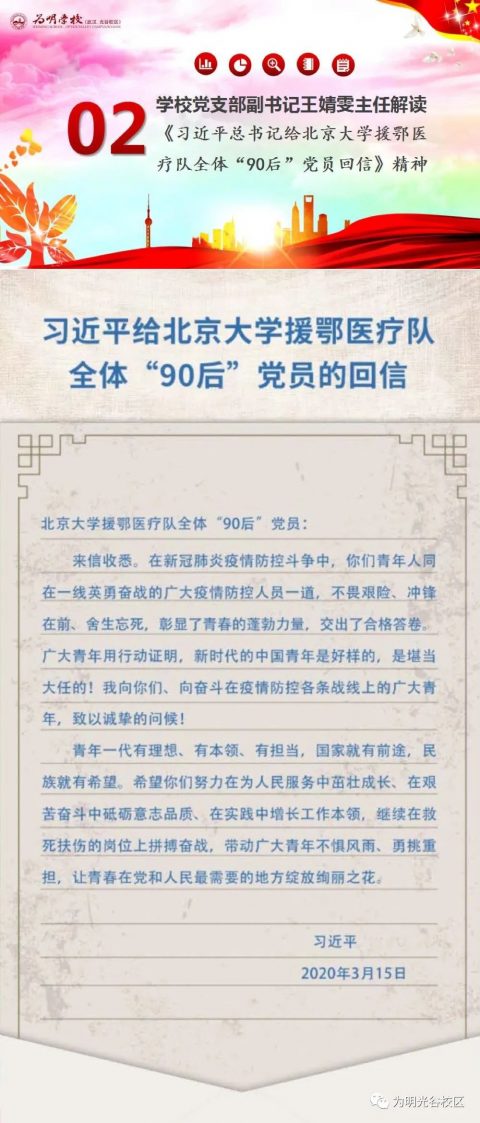 接着,由学校党支部副书记王婧雯主任解读习总书记《给北京大学援厄医疗队全体90后党员回信》的精神。她谈到:在与疫情较量的各条战线上,广大“90后”甚至“00后”的中国青年走在时代前列,他们不畏惧艰难险阻,撑起了新时代共和国脊梁,在战“疫”前线发挥了突出的先锋模范作用。相信未来的同学们也一定能以他们为榜样,能成为民族复兴征途上闯关夺隘、攻城拔寨的先锋力量。