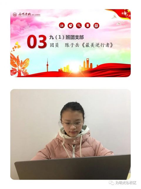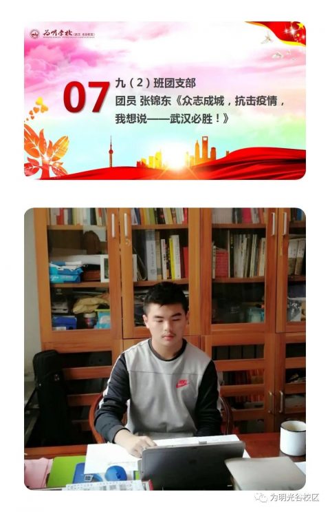 最后,来自九(2)班团支部的团员张锦东同学发言《众志成城,抗击疫情,我想说——武汉必胜!》,他坚定的说到:所有人都参与到了这场疫情防控阻击战中,各有所能,各尽其职。这个春天仍是个有温度的春天。感谢我们伟大的祖国,感谢我们所热爱的党中央。武汉疫情防控阻击战的号角早已在世界的东方吹响,这就是我们的国家在面对危难时的超凡气度和使命担当。这是场没有硝烟的特殊战争,可同样有着战争中的热血沸腾,斗志昂扬,感谢所有义无反顾的逆行者,武汉必胜!
