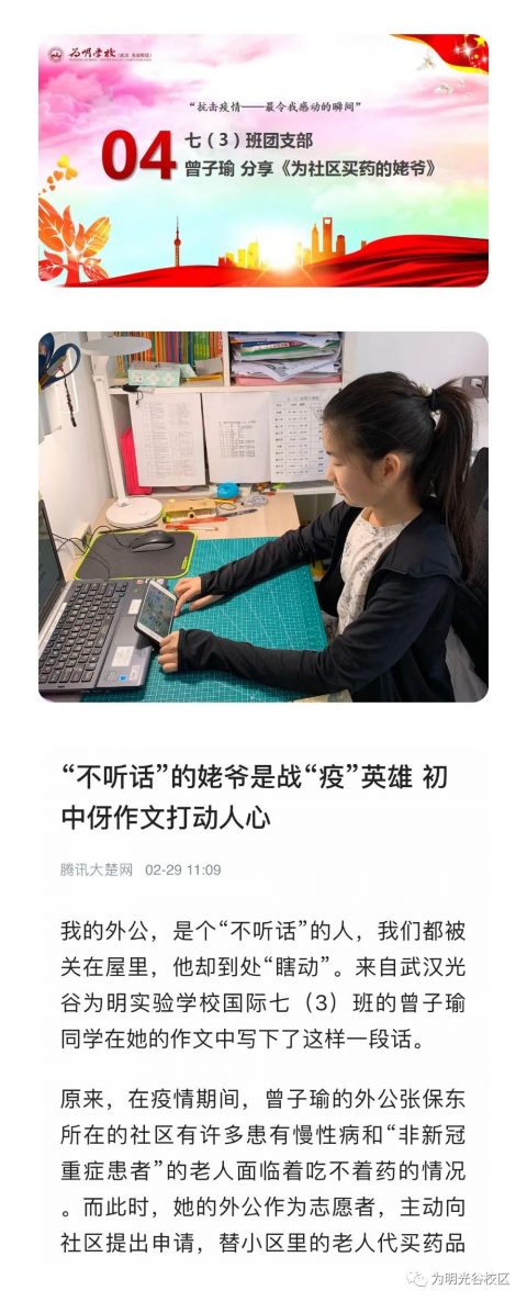 而在“此次抗击疫情最令人感动的瞬间”环节中,来自七(3)班团支部的曾子瑜同学讲述了《为社区买药的姥爷》的故事,这篇文章也获得了征文比赛的特等奖,得到老师和同学们的一致好评。
