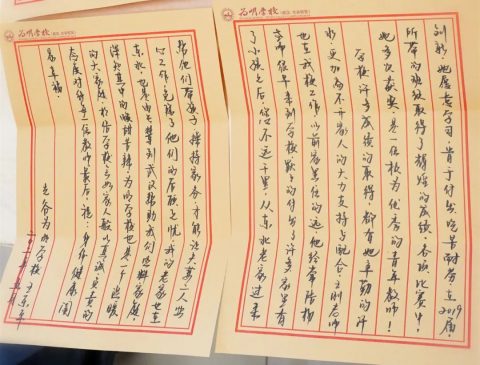 肖丽主任家属:非常特别和珍贵的礼物!与校长合影,定格精彩美丽瞬间!爱心小礼物,带给大家温暖!还有校长亲笔书写的长达四页书信,情真意切,关心满怀,令我们感动!感谢学校领导对肖老师的重视和厚爱!我们定会继续全力支持肖老师的工作!