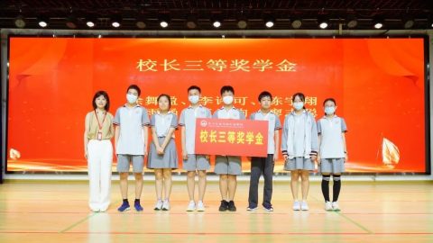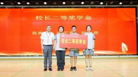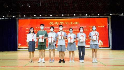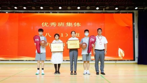 八(1)班和九(3)班获得优秀班集体荣誉称号,班主任和班长共同上台领奖。