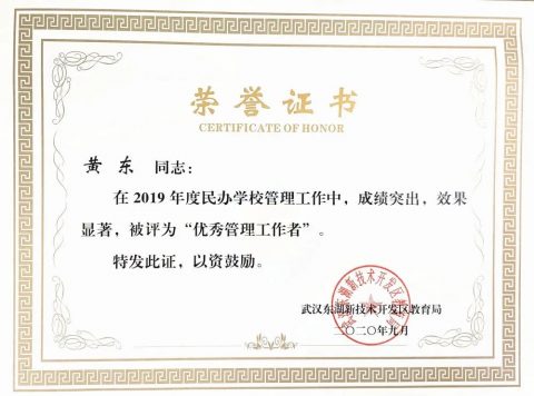 经综合评定,我校荣获“2019年度民办学校优秀单位”荣誉称号,黄东校长被评为民办学校“优秀管理工作者”。