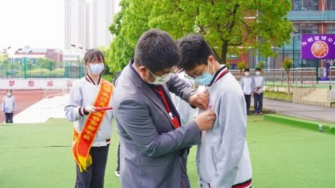 黄东校长、校长助理王乐平校长、校办王婧雯主任为新团员佩戴团徽,这是无比光荣的重要时刻。