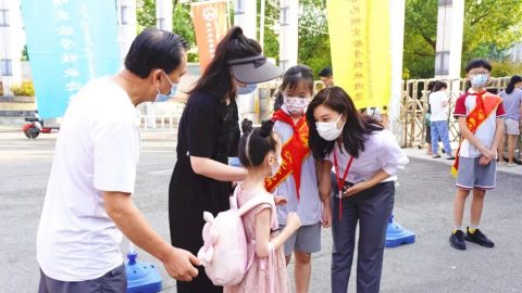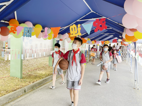 牵着爸爸妈妈的手走到校门口,领导、老师们在门口亲切的迎接每一位同学返校,热情的向大家问好!