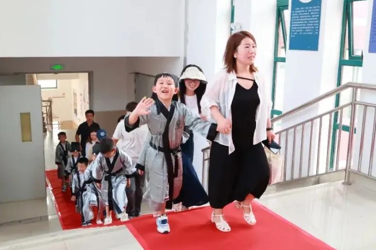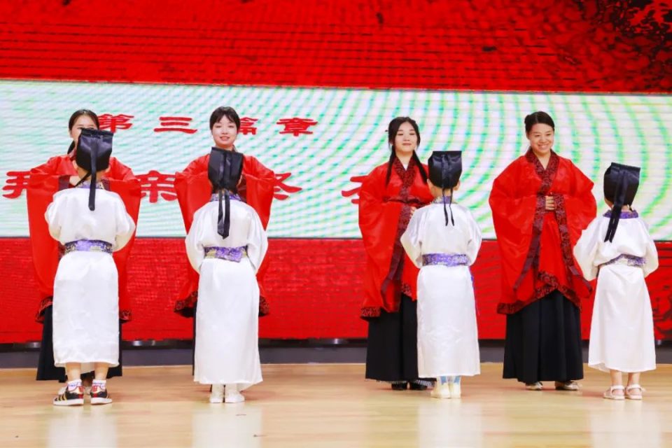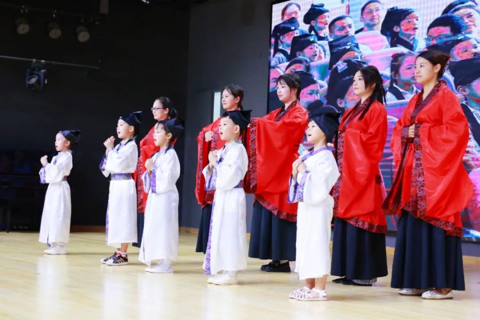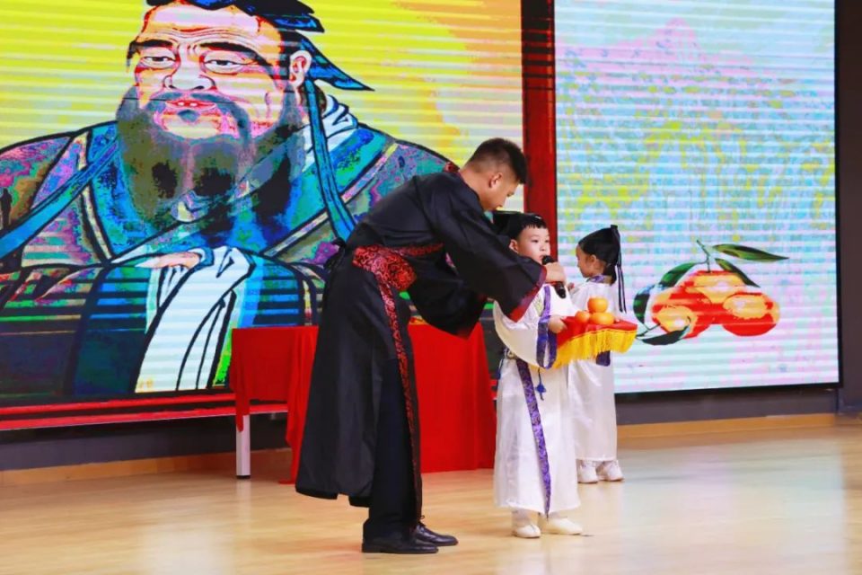 一颗种子长出嫩叶,一颗稚嫩的心灵走向成熟,都是因为有一片成长的沃土和辛勤耕耘的园丁。为了每个孩子的成长,老师们将呕心沥血、倾心付出。班主任和家长分别上台寄语,同学们向父母行礼,感谢父母的养育和教诲;向老师行礼,感谢老师的启蒙之恩。两名童子双手交叠,拇指内扣,向孔圣人像行崇敬礼,表达敬仰,同时也表达对圣人、对优秀传统文化的尊崇。