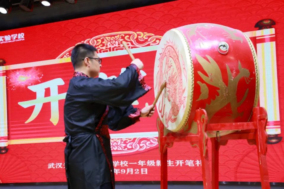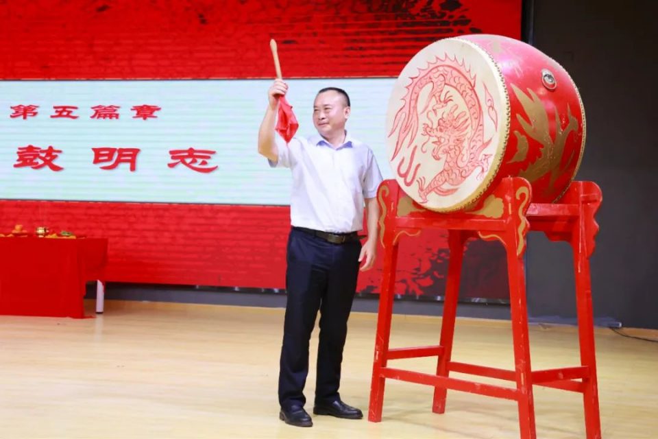 在古代,读书人往往通过击鼓的方式,表达他们要读书上进和考取功名的愿望。当中的“鸣”和“明”同音,古人击一下鼓,表明自己的志向,意为“鸣志”即“明志”。黄校长带领孩子们启迪志向,敲响“明志大鼓”,以示学生从今启蒙,每一声鼓响都代表着对未来的期许和鼓励,向新学子送出祝福语。