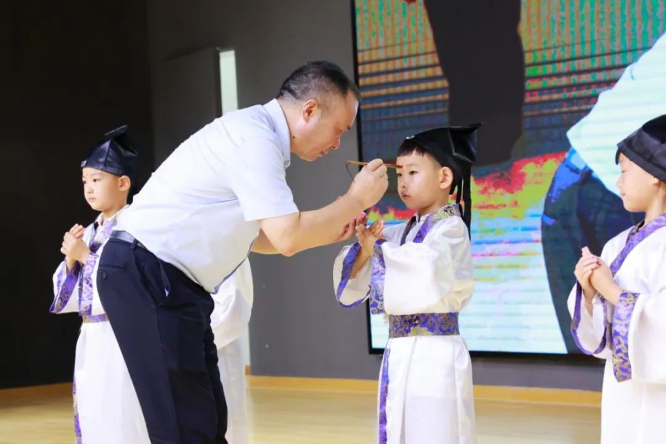黄东校长赐“学”“习”二字。老师们手持红笔,轻轻地在每位新生的额头上点上一颗鲜艳的朱砂痣。“痣”又通“智”,点痣意为开启智慧。这一古老而神圣的传统,寓意着孩子们将从此开启智慧之门,明心见性,勤奋学习。红痣的印记不仅留在了孩子们的额头上,更深深地烙印在了他们的心中,成为他们学习路上的一盏明灯。
