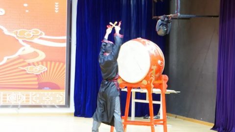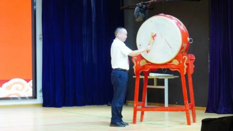 黄东校长敲击大鼓三声以示学生从今启蒙,并向新学子送出祝福语。