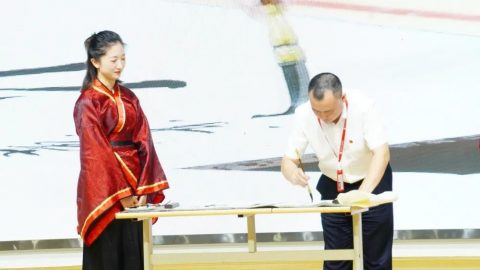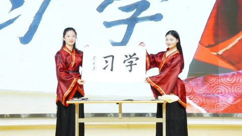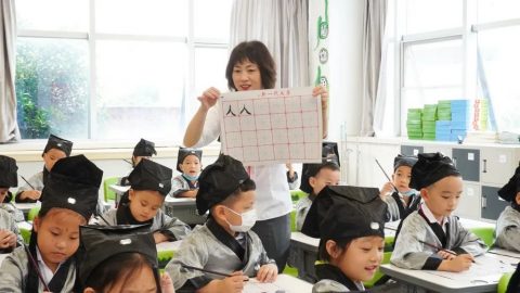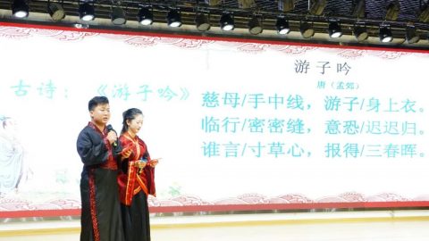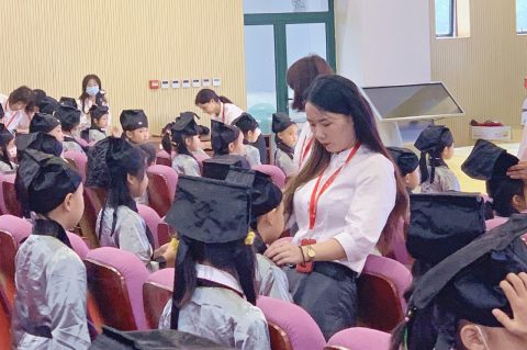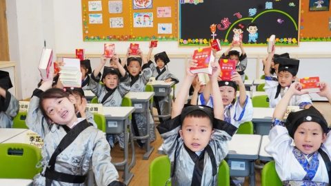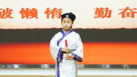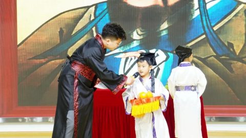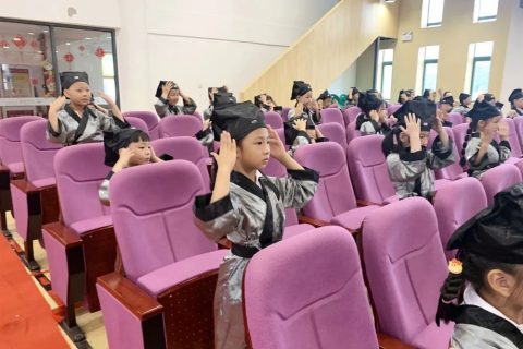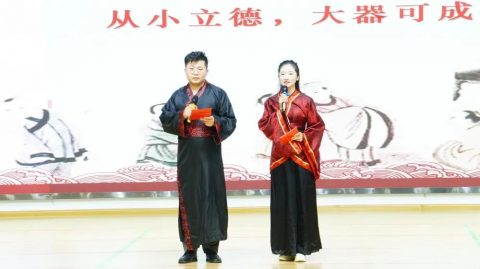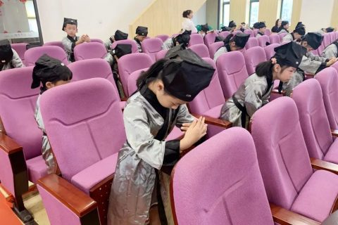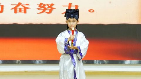 “开笔典礼,鼓声咚咚。新生入学,六岁破蒙。学习知识,掌握技能。懂得礼仪,仁爱聪明。今已入学,收心养性,从小立德,大器可成。”