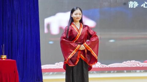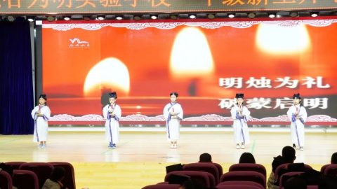 在舞台上,况贤涛老师挥舞鼓槌,奋力击鼓,两位礼官刘玉洁、李飞老师在悠扬的古乐声中走上舞台,明烛为礼,破蒙启明。五位童子依次点亮蜡烛,一破蒙昧,是非分明;二破自私,友爱同学;三破散漫,遵守纪律;四破贪玩,学习为要;五破懒惰,勤奋努力。