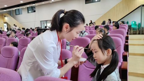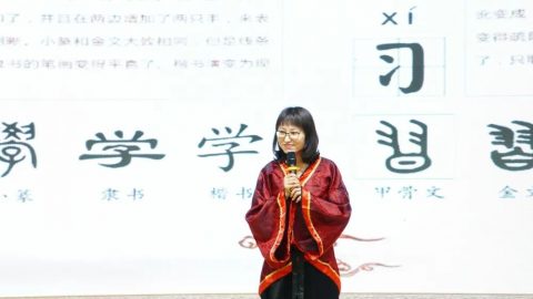 李洁老师解说“学、习”二字的甲骨文和金文之造字要诣。领导和老师们为新生点朱砂,祝愿孩子从此眼明心亮,读书好、好读书、读好书。