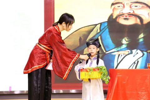 恭祭孔子,万世师表,全体师生向孔子行崇敬礼,以表敬意。童子代表献祭芹菜和橙子祭祀文化圣人,寓意勤奋、诚实。