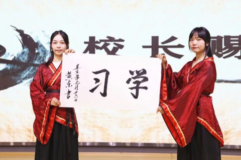 最后黄校长提笔落腕、一笺墨落,为学子们赐“学习”二字。
