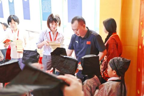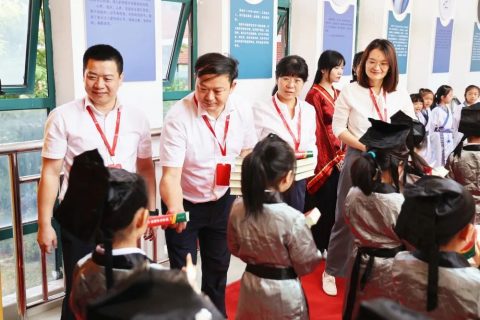 黄校长敲击大鼓三声以示学生从今启蒙,并向新学子送出祝福语。校领导为每位新生发放入学礼物——新华字典。