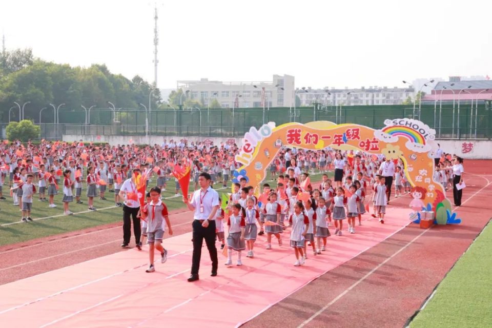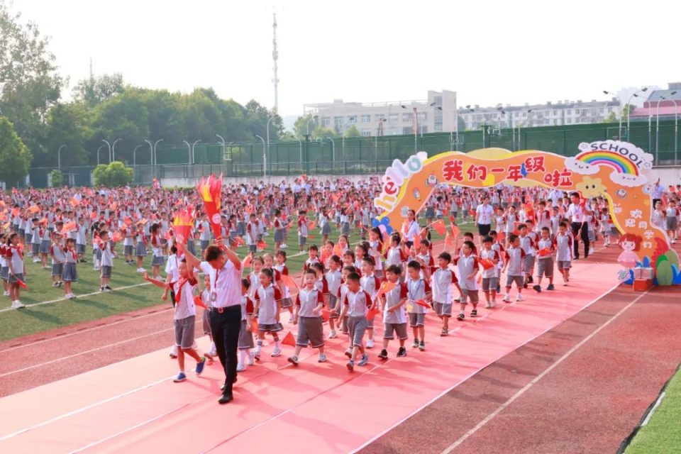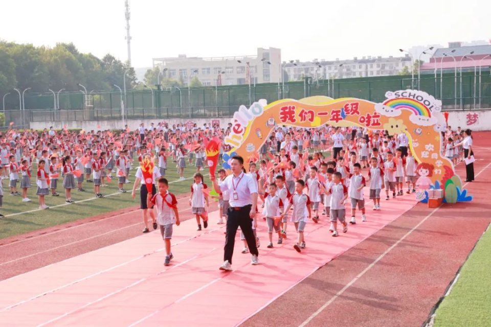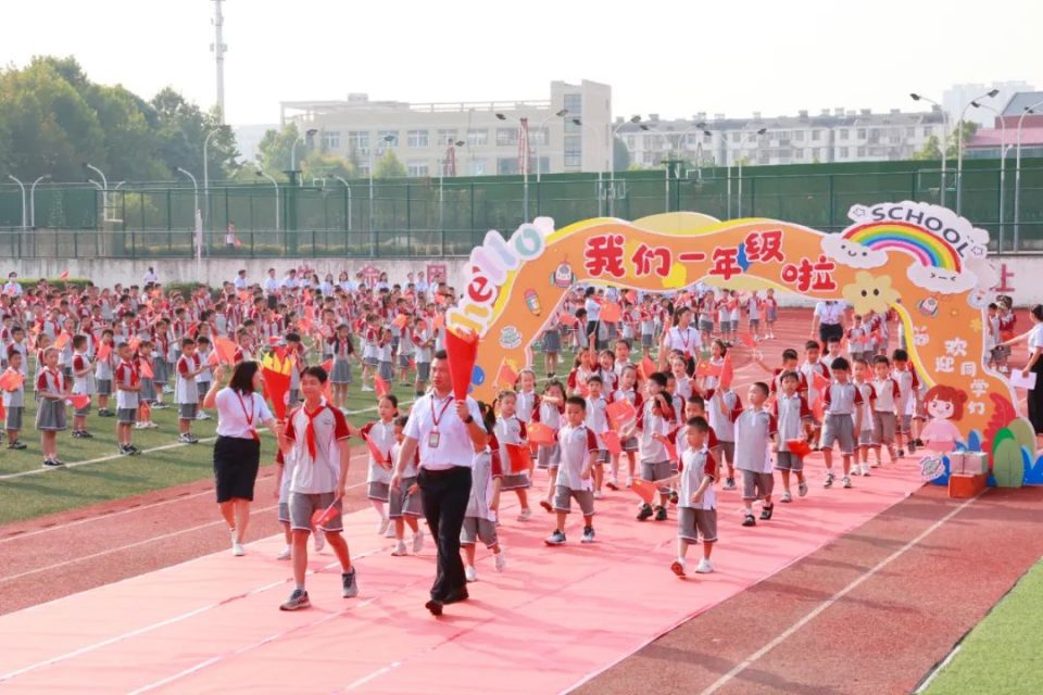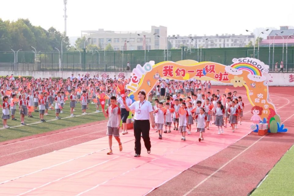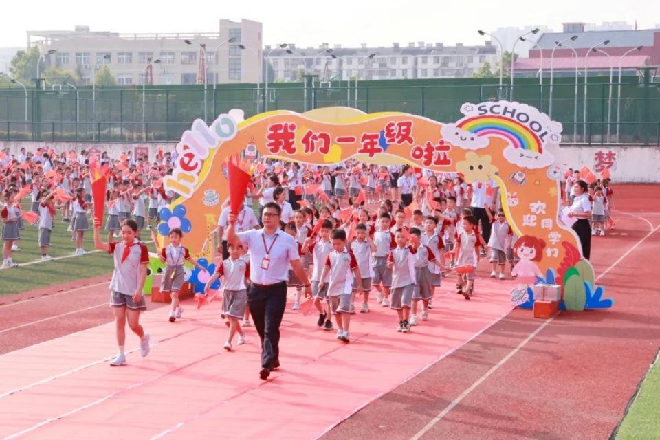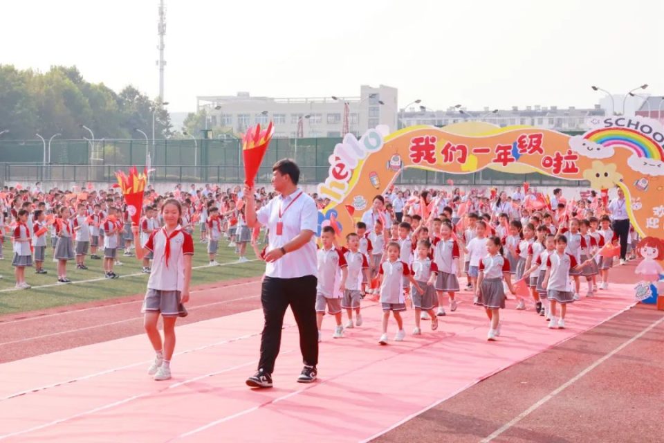 一年级各班学生在火炬手引领员的带领下步入开学典礼现场,全校师生和家长热情欢迎,孩子们脸上洋溢着笑容,开启新的学习旅程。