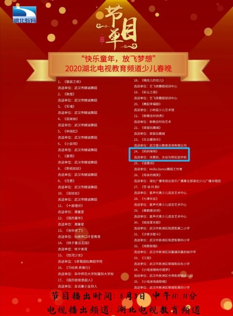 由我校国二2班和校舞蹈队联合表演的英语音乐剧《妈妈咪呀》将于5月3日中午在湖北电视教育频道播出。该档节目为2020年湖北电视教育频道少儿春晚,于2019年12月29日录制。因疫情原因推迟播出,拟于五一黄金假期在全台所有频道率先播放。播出时间为5月3日中午11点11分。我校选送的英语音乐剧《妈妈咪呀》是第24个节目,预计在12点11分左右播出。