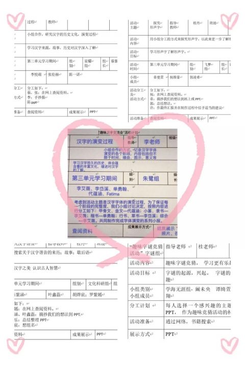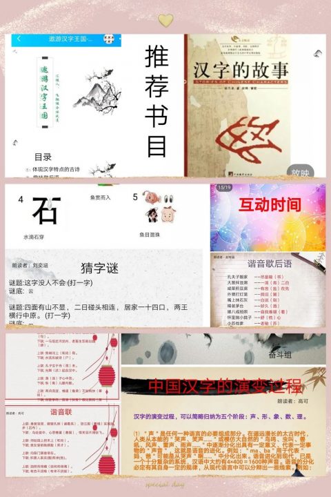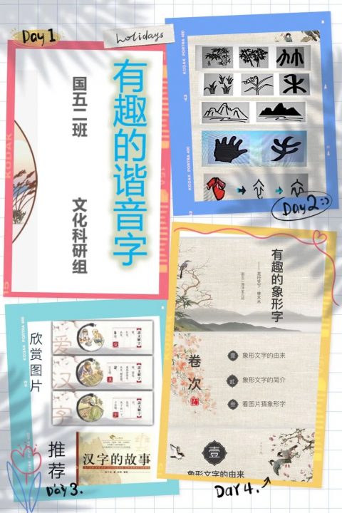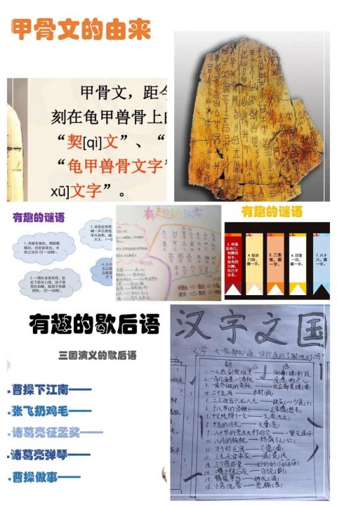 他们以小组为单位,分工合作搜集资料,围绕象形字、有趣的字谜、汉字的演变、形声字、谐音字等他们感兴趣的与汉字有关的内容开展研究。