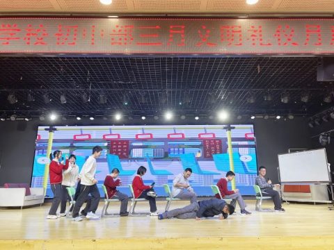 班级主动承担学部“文明礼仪月”启动仪式,学生们自导自演,通过情景剧的方式在舞台上真实还原了校园课堂及课间、家庭、社会,公交车上目前存在的不文明现象,引发观众深思,从而达到“此处无声胜有声”的教育效果,引导同学们规范自己的言行,做文明有礼的阳光中学生。全体学生艺术节上台表演《杯子舞》,尽情展现中学生的朝气蓬勃,每一个孩子都可以享受属于自己的“高光时刻”,以此培养学生自信、乐观的品格。