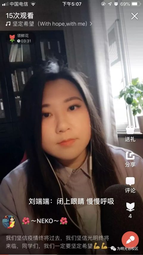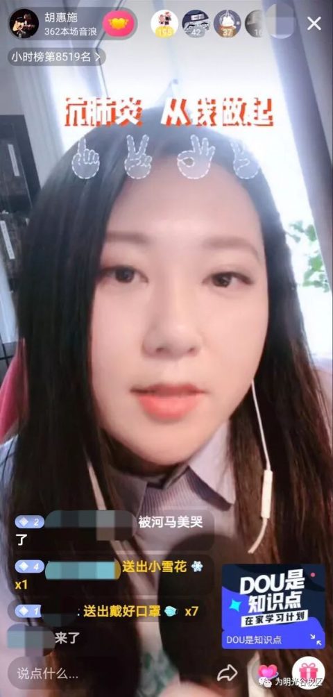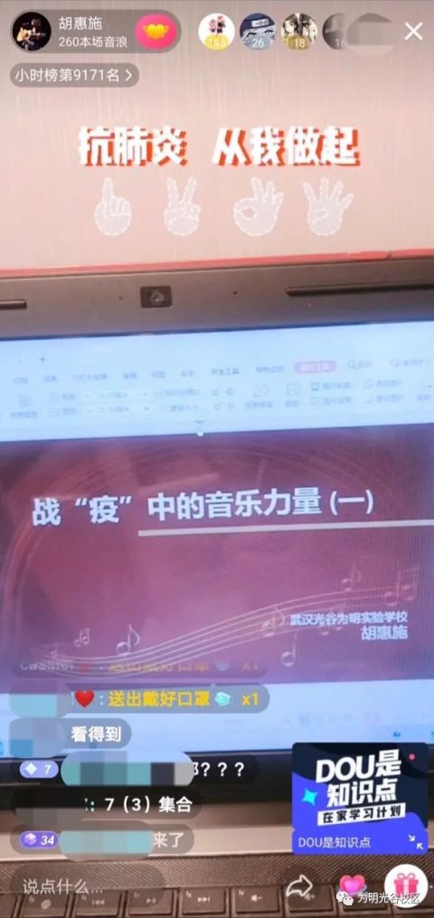 任何事情要做好都不是一件很简单的事,要花很多心思,不论是直播还是课堂教学。这次通过抖音平台去做了这样的直播课程,让我非常感谢这个平台,在直播中,学生跟我送了很多的“口罩”、“洗手液”,特别“应景”。在这样特殊的时期能够让我和学生之间做这样的一个链接,我愿意去了解学生喜欢一些东西。