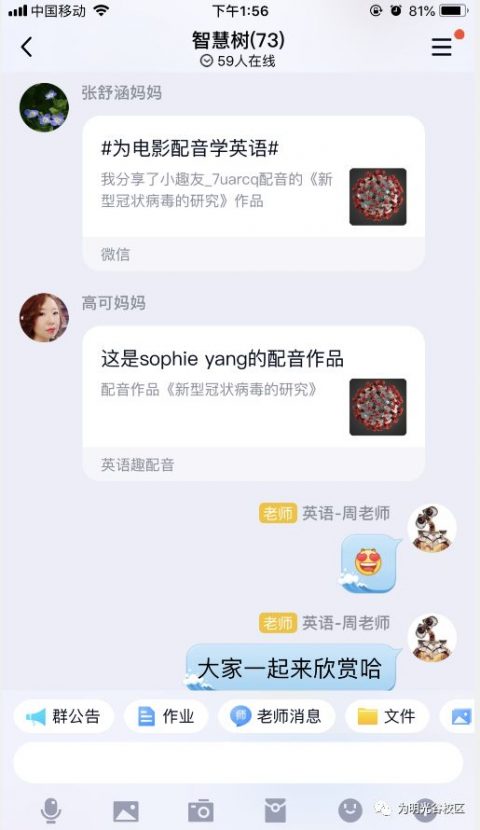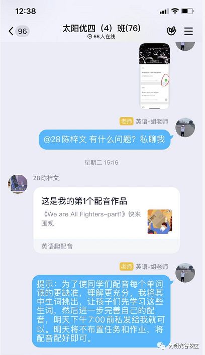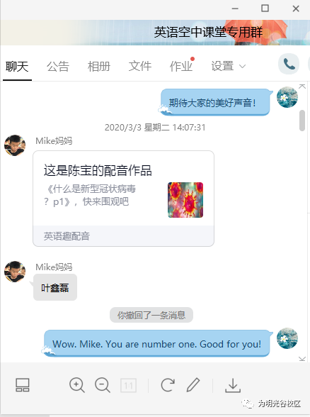 孩子们对英语“冠状病毒”的学习非常有兴趣,在老师的帮助下,解决了像“coronavirus”这样超级生词后,孩子们都跃跃欲试,班级群里分享自己的配音。