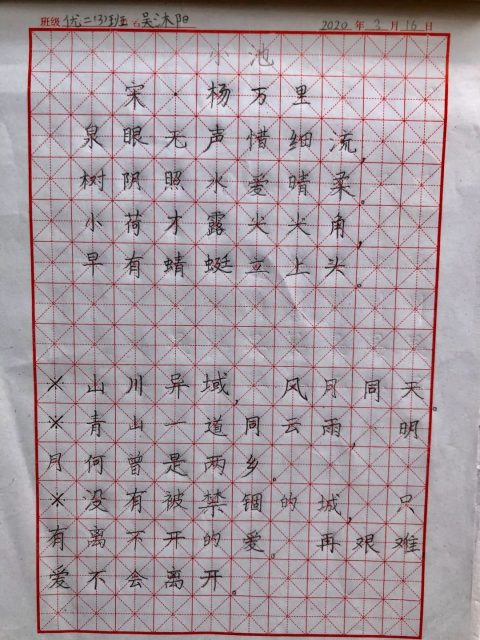 宅家学习的这段日子里,在老师和父母的帮助下,我学会了规划自己的学习任务,积极上网课,认真学习!特别是这段时间以来老师让我们每天坚持练字,我认真的执行,并且发现我的字写得越来越好了;看到自己的书写有进步,我打心底里高兴。
