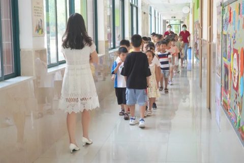 排着整齐的队伍,副班主任将孩子送到车上,交给跟车老师。