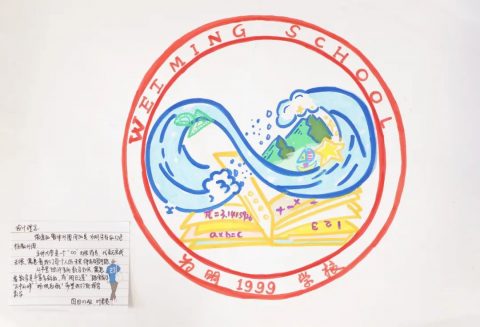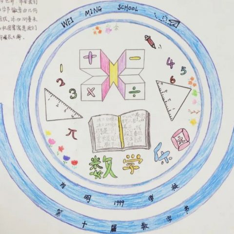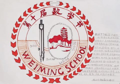 节徽由与数学相关的符号、学具和知识点组成,将数字“10”巧妙地在圆规手握处呈现,寓意本次数学节为第十届。节徽左侧从右往左看是“W”,从左往右看是“M”,合起来是为明的拼音首字母缩写,另外M 又是数学 maths 的英文首字母缩写。其寓意为:张开双臂,拥抱数学节,也寓意在为明学校的呵护下,孩子们开心快乐地成长!