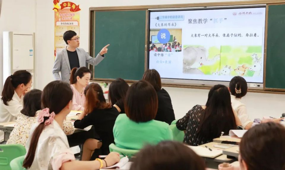 在明确了教研专题之后,各年级教师结合本年级的学情,通过集体研备,分享各自的教学经验和心得,设计出了低中高三个学段创意表达教学方案。小学低段由李佳蓓老师执教《大象的耳朵》,中段由舒苗苗老师执教《我的动物朋友》,高段由李洁老师执教《文言文二则<两小儿辩日>》。