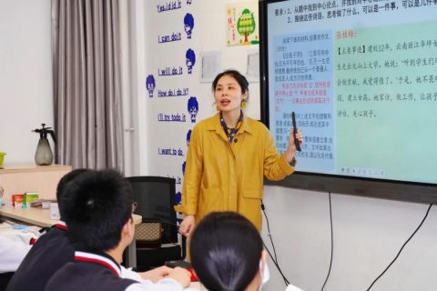 周婉老师在九(2)班执教中考阅读复习课《读懂句意,明确作答—中考题型之“理解句子含义”解题探究》,周老师实现了答题思维的可视化:审清题干——找答题区间——抓关键词句——分析关键词本来意思——理解关键词语境意义——把模糊的表达说明确。学生上台展演,争先恐后;推敲答案,各抒己见;改写答案,信心满满。