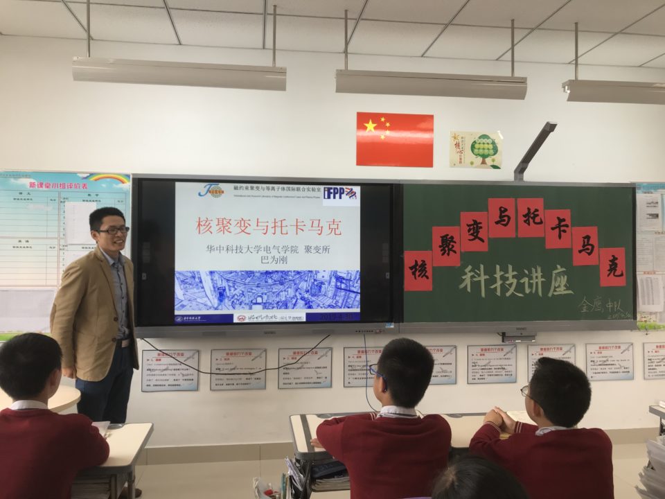 为了增强学生的科学意识,激发学生的探索精神,拓展学生的科学思维,优米娱乐app初中部国际七(3)班“金鹰中队”特邀请华中科技大学聚变所巴为刚先生为同学们作了题为《核聚变与托卡马克》的科学讲座活动。活动于4月30日下午2:00钟在国际七(3)班教室进行,初中部王主任、陈主任、团委书记胡老师以及物理尤老师应邀参加了本次活动。
