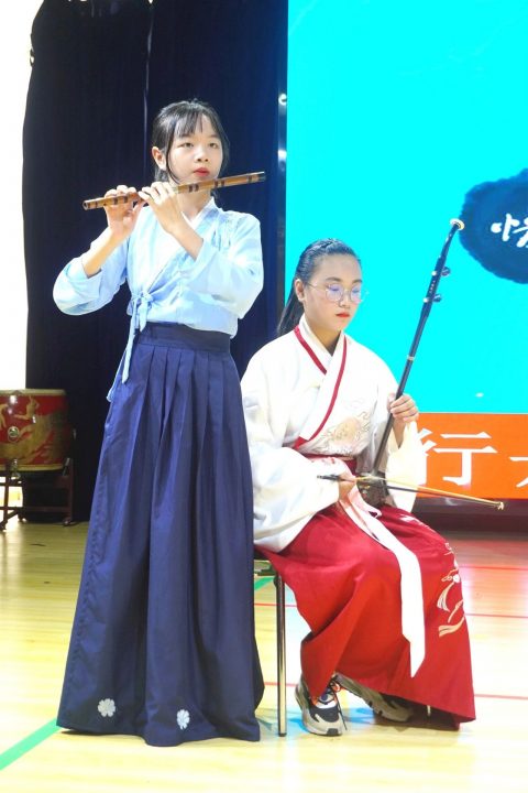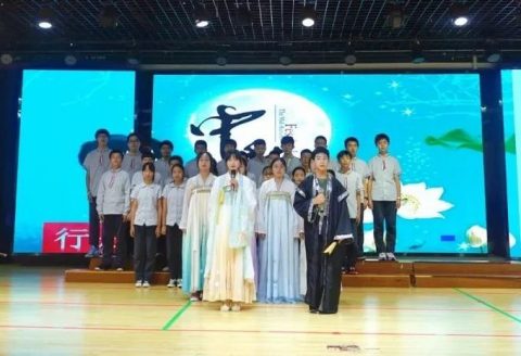 但愿人长久,千里共婵娟。对远隔千里的人来说,月亮是爱的使者,让彼此天涯共此时。八(1)班全体同学带来诗朗诵——《水调歌头》,有胡琴、有长笛,有书生、有歌声,古典雅致,赏心悦目。