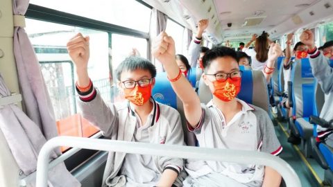 全体九年级教师在报告厅门口为同学们佩戴幸运手环,为了将好运延续,除了幸运手环,还有“中考加油”口罩和“逢考必过”幸运袜相伴……
