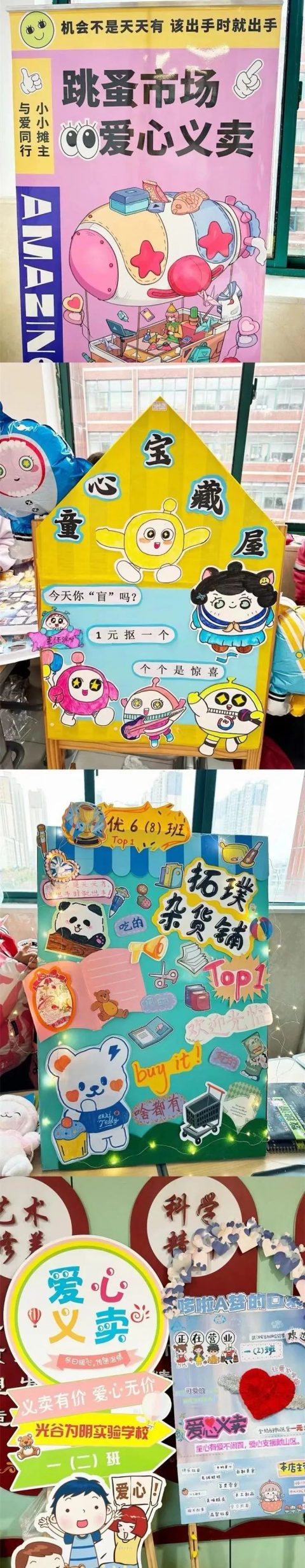教室门口的走道已“大变身”。同学们设计并张贴起了爱心宣传海报,还用气球、鲜花装饰了摊位。一块海报和几张课桌,就是展台,上面摆满了同学们自己心爱的学习用品、小玩具、图书、亲手创作的小工艺品和书画作品……种类丰富的商品,五花八门的促销设想,还有各种妙趣横生的宣传语,每个摊位都创意十足。
