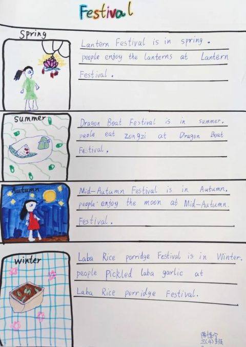 低段孩子们爱说、爱书写、爱绘画,乐于表现。英语老师们经过精心设计,鼓励孩子创作出了丰富多彩的特色英语作品,让他们的“个性在作品中彰显,思维在作品中发展,知识在作品中升华。”在一年级初始阶段,课上我们要求学生对字母书写进行规范抄写,课后鼓励学生做手抄报或画创意字母,激发学生学习兴趣。