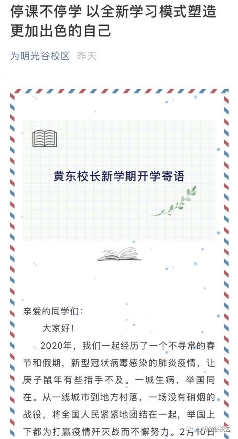 因为新冠肺炎疫情的持续,老师和同学们还无法回到熟悉的校园里。但是正因为这个新学期如此不同,学校和每一位老师,都希望能给学生一个富有仪式感而有意义的开学体验。早上七点不到,黄东校长满是关怀鼓励,饱含殷殷期待的新学期寄语就发放到了孩子们的手中,让每个光谷为明的学子都感受到了浓浓的开学氛围和深切的关爱。