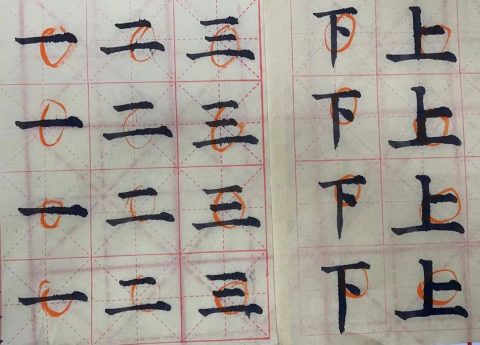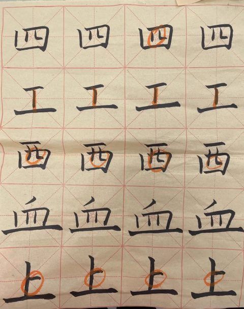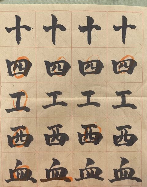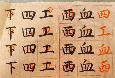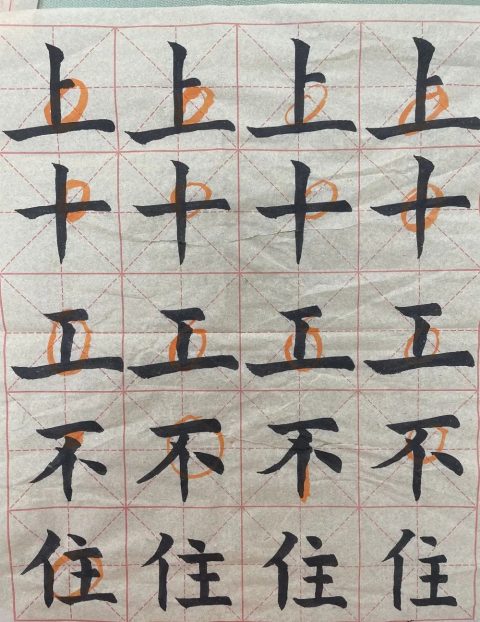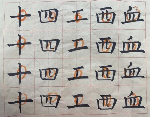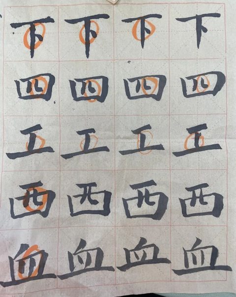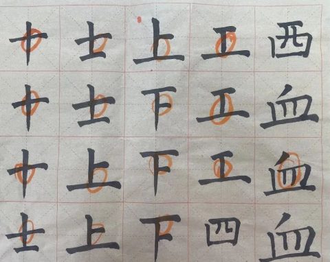 黄校长已预见了大家在书写时可能会出现的问题,他提醒大家:点在不同的位置,有不同的写法。“立、火、少、不、清”它们笔画中都有点,写法却不尽相同,一定要因字而异。经黄校长提醒,我们教师在书写练习中更注意观察字形的结构、占格的高低,心里也愈加佩服黄校长,他不仅字写得好,教学也非常细致严谨。