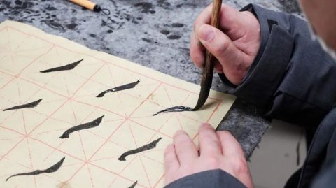 黄校长说:“师傅领进门,修行靠个人。培训课上先多教几个基本笔画,老师们可以下去慢慢练习,下面再教大家‘点’的写法。”老师们一听要学“点”都很高兴。因为“点”很简单。黄校长没有说如何写,而是先示范写了几种点。只见那毛边纸上的“点”,如鸟翻身侧下,又如高山坠石,在很短的距离里笔锋做出了许多动作。大家看傻了眼,本来以为最简单的一笔,原来这么多讲究,赶紧虚心求教。助教罗老师慢速展示:侧点向右上逆锋起笔,向右下顿,沿顺时针方向向左上圆转回锋收笔。挑点露锋起笔右下顿笔,稍提再向右上迅速挑出。撇点起笔与撇同,稍顿笔向左下撇出。罗老师边说边示范,学员在下面眼睛都不敢眨一下,生怕看漏了哪一笔。