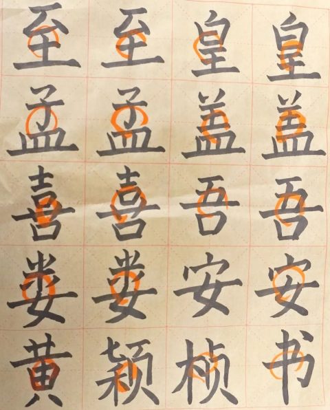 这节课的重点是学习一种新技法——“向背”。所谓“相向”,相当于两人面对面的姿态,像小括号“( )”,书法中类似“外拓”的形态;“相背”,则与“相向”的姿态相反,像这个“) (”符号,书法中类似“内擫yè”的状态。书法作品以灵活多样为美,最忌平行少变,有了向背变化,可以使笔画呼应,和谐匀称,也有利于还原笔锋,方便下一步运笔。